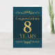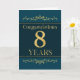Il s'agit d'une carte de 8e anniversaire d'employé. Le design est formel et élégant et mis contre un arrière - plan de couleur jade avec des effets de papier doré et des éléments décoratifs. VEUILLEZ NOTER : L'effet de feuille d'or est numériquement simulé, aucune feuille réelle ne sera utilisée dans la fabrication de cette carte. Conception par NATALIE KINNEAR