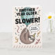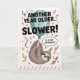 Mignonne paresse portant un casquette de fête, tenant un ballon, avec le message drôle "Encore un an plus... PLUS LENT !" et un joueur "Est-ce mon anniversaire ?"