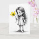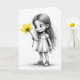Un croquis d'une jeune fille aux cheveux longs tenant une fleur jaune tout en la regardant avec émerveillement aux yeux larges. Le texte peut être modifié.