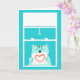 Envoyez de l'amour à quelqu'un de spécial avec cette jolie carte de voeux. Elle présente un chat vert menthe dans une fenêtre tenant une enseigne avec un coeur dessiné dessus. L'illustration est définie sur un arrière - plan bleu turquoise. La carte est vierge sur le devant et comporte un message à l'intérieur qui peut être personnalisé avec votre propre salutation spéciale. C'est parfait pour faire savoir à quelqu'un que vous pensez d'eux et faire une bonne carte pour les amoureux de les chats de tous âges. Avec ses couleurs vives et sa jolie illustration, il ne manquera pas de les encourager !