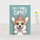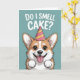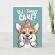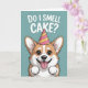 Une carte d'anniversaire mignonne et drôle avec un adorable corgi de dessin animé portant un casquette de fête et souriant avec excitation sous l'expression "Est-ce que je sens le gâteau ?" Parfait pour les amoureux de les chiens, les amis et toute personne qui aime l'humour d'anniversaire ludique.