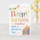 Une carte d'anniversaire colorée et textuelle pour une grand-mère, avec du Polka Dot Bunting, des bougies d'anniversaire rayées et brillantes et parsemées d'étoiles à effet or. Le texte à motifs dit : "Joyeux anniversaire" et il y a aussi "Bonne journée !" en lettres bleues (NB, les étoiles et les contours de l'effet or seront vus et ne seront pas imprimés à l'encre métallique.)
