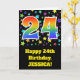 L'avant de cette carte de voeux d'anniversaire passionnante, amusante et vibrante présente un motif de formes étoiles colorées, ainsi que le numéro "24" avec un motif multicolore de gradient de spectre inspiré arc-en-ciel, sur un arrière - plan de couleur noire. L'avant comporte également un message d'anniversaire, y compris un nom de destinataire personnalisable. L'intérieur comporte un message de voeux d'anniversaire customisé, ou peut-être pourrait-il être effacé et laissé vide si un message doit être écrit à la main à la place. Une carte d'anniversaire personnalisable comme celle-ci pourrait être une façon amusante d'envoyer des voeux d'anniversaire à quelqu'un qui célèbre son vingt-quatrième anniversaire. [~Z0000348]