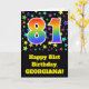 L'avant de cette carte de voeux d'anniversaire passionnante, amusante et vibrante présente un motif coloré inspiré du champ d'étoile, ainsi que le numéro "81" ayant un spectre arc-en-ciel multicolore comme motif dégradé, sur un arrière - plan de couleur noire. L'avant comporte également un message de bienvenue d'anniversaire, y compris un nom de destinataire personnalisé. L'intérieur comporte un message d'anniversaire personnalisé, ou pourrait être effacé et laissé vide si un message doit être écrit à la main à la place. Une carte d’anniversaire personnalisée comme celle-ci pourrait être une façon amusante de reconnaître les quatre-vingt premiers ans de quelqu’un. [~Z0000348]