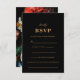 Carte Faire-part de mariage RSVP noir et rouge foncé. Texte couleur cuivre entièrement personnalisable. La couleur arrière - plan noire peut être changée. Arrière - plan floral foncé au dos de la carte. Moody, élégant et moderne.