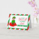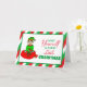 Joli petit lutin festif dessiné à la main assis sur le sac de jouets du Père Noël. Carte de Noël festive rouge, verte et blanche qui peut être personnalisée à l'intérieur. Ajoutez simplement votre nom dans la section personnalisée.