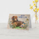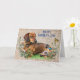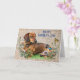 Father's Day card featuring a cute, brown dachshund. Horizontal, folded card with sample message inside. Give to dad from the dog, or from the family. "Happy Father's Day" printed text on the front in dark blue. Include a personal message inside using a hand-written font. A trail of paw prints are next to the wording. The back of the card has a pattern of paw prints. Choose the printed card, or download version.