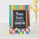 This greeting card features a festive scene centered on a rectangular black message panel with a natural wood-toned frame. Across the middle, the text reads “Happy Easter to our favorite GRANDSON,” with “Happy Easter to our favorite” in white and “GRANDSON” in larger, all-cap white lettering for extra emphasis 🐰. At the base of the frame, a generous pile of egg-shaped decorations gathers close together, like they’ve been arranged with extra care for someone special. The eggs are colored in soft pink, yellow, sky blue, and mint green, and several show stripes and zigzag patterns that add a sweet, friendly energy 🐇. Behind everything, tall vertical stripes in deep blue, sunny yellow, green, light blue, orange, and coral set a lively backdrop that makes the framed message stand out. The lighting is even and gentle, letting the wood frame look warm and the colors feel fresh without harsh shadows. The striped background runs from top to bottom, while the patterned eggs cluster tightly along the lower edge of the framed sign.