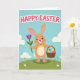 This card shows a sweet upright rabbit 🐰 in warm tawny tones, with pink inner ears, rosy cheeks, and a wide smile that feels like it’s meant for someone special. A small yellow bow tie sits at its neck, adding a friendly, dressed-up touch as it stands on a green grassy hill sprinkled with white daisies and tiny orange flowers. In one paw it holds a tall purple tulip 🌷, angled like a gentle offering, while the other paw supports a woven basket tucked close like a thoughtful gift. The basket is filled with decorated eggs in bright colors, including blue-and-white stripes, yellow swirls, and pink wavy lines that suggest careful attention and affection. Across the top, a large seasonal greeting appears in pink letters with a white outline, centered high in the sky for easy reading. Behind the character, the background is a pastel blue sky with a few rounded white clouds drifting above the hill. The tulip’s purple bloom stands out crisply against the soft sky, with the green stem running straight up beside the rabbit’s smiling face.