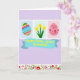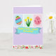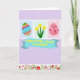 This design shows a spring greeting scene centered on a wide blue banner carrying a golden-yellow message, with the lettering placed neatly across the middle. Above it, three small side-by-side panels create a gentle story: the left panel holds a richly patterned egg shape in blues, reds, and yellows, while the right panel shows a soft pink egg with dots and curling decorations. In the middle panel, three bright yellow, star-like flowers rise on green stems, leaning toward one another like close friends sharing a quiet moment 🌷. A soft lavender background ties everything together, making the colors feel tender and inviting rather than loud. Along the bottom, a floral border frames the scene, and a brown long-eared bunny peeks up as if looking for someone special 🐰. The banner text sits in the center in golden-yellow, standing out clearly against the blue field. The border is filled with stylized leaves and blossoms, and the bunny’s ears lift above the flowers at the lower edge.