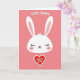 This greeting card features a tall, vertical layout on a soft pink background that sets a gentle, friendly tone 🌷. Centered near the top is a simple white bunny head with long ears, closed eyes with tiny lashes, and a small red heart-shaped nose that hints at a sweet crush 🐰. Light rosy circles on the cheeks add a bashful look, as if the bunny is smiling quietly at someone it cares about. Above the bunny’s ears, the phrase “SOME BUNNY” sits in white, placed neatly so it feels like it’s floating in the open space. Below the face, a large red heart with a thin white outline anchors the design and draws the eye downward. Inside the heart, the words “LOVES YOU” appear in white, centered and easy to read against the red. Soft shadows around the white bunny shape give it a lightly layered look against the pink field, and the red heart sits just beneath the chin with crisp edges and a bright white border.