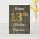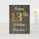 Ce simple design de carte d'anniversaire comporte le message "Joyeux 13ème anniversaire", avec le "13ème" ayant une apparence fausse or. Il porte également un nom customisé et un arrière - plan de faux bois. Il pourrait être donné à quelqu'un qui célèbre son treizième anniversaire.
