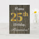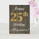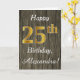 Ce simple design de carte d'anniversaire comporte le message "Joyeux 25ème anniversaire", avec le "25ème" ayant une apparence fausse or. Il est également doté d'un nom personnalisé et d'un arrière - plan d'apparence en faux bois. Il pourrait être donné à quelqu'un qui célèbre son vingt-cinquième anniversaire.