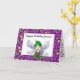 Carte Happy Birthday personnalisée avec une fée blonde caucasienne dessinée à la main sur le devant tenant des fleurs.