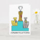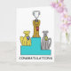 Trois chiens portant des rosettes debout sur un podium, le chien supérieur a une tasse d'argent dans ses pattes. Le mot "Félicitations" se trouve sous l'image.