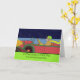 Félicitations à une merveilleuse grand-mère pour sa nouvelle voiture, carte de voeux papier avec thème vintage. La carte a un look rétro vintage avec voiture classique en rouge et vert. Une femelle aux cheveux chameaux, à la longue écharpe jaune, aux gants jaunes et au casque vert citron, jaune et magenta conduit une voiture classique la nuit sous les étoiles. Copyright © Shoaff Ballanger Studios.
