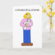 Une femme blonde aux cheveux tenant un chaton blanc moelleux avec le mot "Félicitations" au-dessus de l'image.