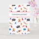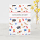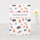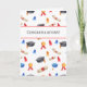 Carte de remise de diplôme mignonne avec un motif de diplômes, de caps de graduation noirs, de glands rouges et bleus et de médailles. Dans la partie supérieure du motif, il y a un rectangle blanc avec des bords rouges où le sentiment "Félicitations !" est affiché en gris. Personnalisez le texte avec votre propre message si nécessaire ou laissez-le tel quel. Illustré et conçu par Patricia Alvarez.