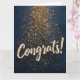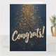 Cette image célébrant un événement et élégante présente une explosion de confettis dorés et de paillettes qui tombent en cascade depuis le haut du cadre. Les étincelles dorées brillent vivement sur un fond bleu marine profond et texturé. Le point focal est le mot "Félicitations !" écrit dans une police gras, blanc crème, de style coup de pinceau, qui ajoute une touche personnelle et artistique. Ce graphique est parfait pour annoncer un succès, une remise de diplôme, ou toute autre étape joyeuse avec une touche de sophistication et d'élégance.