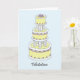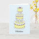 Un gâteau glacé multicolore rose, blanc et citron, sur un fond bleu pastel. L'image est accompagnée du mot 'Felicitations'.