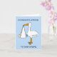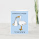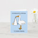 Dessin d'un bébé tenant dans un drap suspendu au bec d'une cigogne. L'image est fixée contre un arrière - plan bleu et accompagnée des mots "Félicitations aux deux mamans".