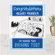 Félicitations pour avoir réussi votre test de conduite. Illustration amusante d'un instructeur de conduite nerveux ou d'un examinateur de conduite. Personnalisez avec votre choix de nom. Carte de félicitations pour un conducteur nouvellement qualifié.