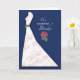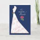 Une fleur de pivoine rose est mise en valeur sur ce fond bleu marine. La fleur de pivoine est également présente sur la ceinture verte de la robe élégante ornée de volutes roses. Félicitez et offrez vos meilleurs vœux à la mariée pour sa fête de mariage !