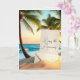 Un papier d'invitation vierge avec enveloppe repose sur une plage de sable sur fond de palmiers doucement balançants et d'un océan serein sous un soleil couchant vibrant pour le 5ème anniversaire. Tout le texte peut être modifié.