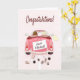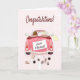 Envoyez au couple heureux cette carte de félicitations pour leur mariage. Un couple heureux se déplace avec un panneau ‘Just Hitched’ et des boîtes à l'arrière de leur convertible. Design © 2015 Julia Bryant.