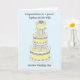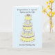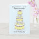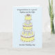 Un gâteau de mariage trois étages élégant de couleurs pastel, sur fond bleu clair. Les mots 'Félicitations à notre neveu et à sa femme pour leur mariage'.