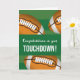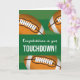 Célébrez l'excitation de marquer un toucher avec ce design de football audacieux avec des balles brunes contre un terrain rayé vert. Parfait pour féliciter un joueur après un grand match, montrer la fierté de l'équipe, ou reconnaître une réalisation spéciale sur le terrain. Une façon spirituelle de partager la joie et l'encouragement.