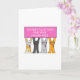 Quatre chats caricaturaux portant des rubans roses brandissant une pancarte rose qui dit "Félicitations d'être un an sans cancer".