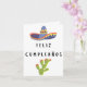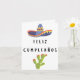 Carte d'anniversaire espagnole (tarjeta de cumpleaños) avec message d'anniversaire en espagnol (Feliz Cumpleaños, heureux anniversaire en espagnol) et illustration traditionnelle mexicaine de sombrero et cactus. Inclut le message d'anniversaire dans la carte, 'Feliz Cumpleaños'.