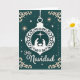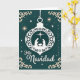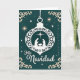 This card shows a peaceful and classy tribute to Christmas. In the middle, there's a stunning white ornament hanging against a deep teal background. Inside the ornament, you can see a nativity scene with Joseph, Mary, and baby Jesus under the Star of Bethlehem. The scene is detailed but simple, telling a spiritual story clearly. Around them, there are sparkling stars in white and gold, creating a magical nighttime feel. Cream-colored designs decorate the corners, adding a touch of elegance.