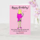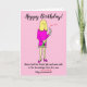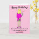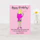 Dessin humoristique d'une femme qui n'a pas coupé ses cheveux depuis le confinement, tenant une bouteille de vin et un verre à vin pour célébrer son anniversaire. La légende indique "Joyeux Anniversaire" et "Nom a reçu sa dose de Covid et était en sécurité dans la connaissance qu'elle était complètement intoxiquée (Inoculée a été barré)". La carte a un fond rose et la femme porte une robe rose. Personnalisez facilement cette carte en modifiant le texte du modèle. Merci d'avoir consulté mes créations de dessins animés !