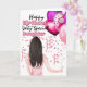 Une belle illustration d'une femme aux longs cheveux foncés debout avec son dos à vous porte une jolie robe d'été rose et tient des ballons roses, violets et blancs vibrants. Les mots, joyeux anniversaire à une fille très spéciale (qui peut être changée en belle-fille, petite-fille, nièce, filleul, etc) apparaissent sur un arrière - plan blanc. L'intérieur a un beau message tendre qui devrait être customisé pour convenir à toute relation familiale que vous avez insérée sur le devant.