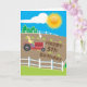 Carte d'anniversaire d'enfant avec des images de couleur vive d'un fermier dans son tracteur qui s'occupe de sa ferme par temps ensoleillé. Personnalisé avec le nom de votre enfant sur le tracteur et Joyeux anniversaire dans le champ fraîchement labouré.