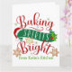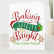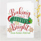 Cette carte festive de Noël contient l'expression "Baking Spirits Bright" dans les couleurs rouge, vert et or de Noël. Le design comprend un chapeau de Père Noël, un saint aux baies, des biscuits de Noël et des accents de starburst. Personnalisez en ajoutant votre nom à l'avant et en customisant le message à l'intérieur et/ou en ajoutant votre nom.