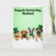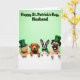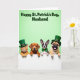 Designed with a vertical layout, this St. Patrick’s Day card features four young animals lined up along the bottom, leaning forward as if sharing a friendly secret with you. Behind them, a soft green gradient background sets a fresh, festive scene 💚. A crisp white horizontal divider runs across the lower portion, and each animal rests its front paws on the edge, adding a cozy, close-up feel. The group includes an orange tabby kitten, a warm brown puppy, a black-and-white pup, and a fawn-colored pug, all with bright eyes and gentle, affectionate expressions. Tiny green top hats with small golden buckle details sit on the kitten and the pug, while the black-and-white pup wears a matching green bow tie ☘️. Above the divider, dark green celebration text is placed near the top against the green background, easy to spot without overpowering the art. Soft, diffused lighting brings out the fur textures, from the kitten’s stripes to the dogs’ smooth coats, and the white divider stays sharp and bright across the front.