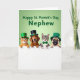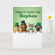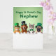 Designed with four young companion animals lined up along the lower half, two cats and two dogs peek over a bright white ledge with their small paws resting on top, as if leaning in close like friends sharing a secret 💚. Behind them, a soft green background sets a St. Patrick’s Day mood, and gentle light adds a tender shine to their fur and eyes. Three of the animals wear tiny green top hats, one finished with a gold buckle, while the fourth sports a black top hat with a matching buckle for contrast. A striped tabby cat adds a green bow tie, and the slightly tilted accessories make the group feel cozy and close-knit, like they’re posing together for someone they care about ☘️. Their wide eyes and small open smiles aim upward, giving the sense that they’re looking at a favorite person just out of view. Across the upper area, a short holiday greeting is set in thick green lettering, centered above their heads and easy to spot against the green backdrop. The hats have a light sheen, the fur looks soft and layered, and the white ledge runs straight across the image beneath their paws.