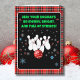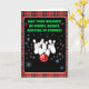 This festive holiday bowling greeting card features bowling pins with red glitter and a red bowling ball with snowflakes pattern on a cheerful red plaid background the perfect design to spread seasonal fun and holiday cheer.