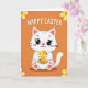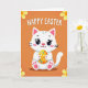 This card shows a stylized white cat with faint gray stripes, round glossy black eyes, and rosy pink touches on the cheeks, ears, and paw pads, posed front and center as if leaning in for a gentle cuddle. The cat’s paws cradle a shiny golden egg, and the careful way it holds it suggests a sweet, friend-to-friend kind of affection. The egg is decorated with tiny flower shapes and confetti-like dots in blue, red, and white, adding a festive spring feel 🌷. Above the character, rounded white lettering sits near the top, standing out clearly against the background. Behind everything is a smooth orange gradient that shifts softly in tone, keeping the scene warm and cozy without looking busy. Two simple five-petaled yellow flowers frame the layout on a diagonal, giving the cat and egg a little stage to shine 🐰. A small yellow flower rests in the upper left corner, while another matches it in the lower right corner.