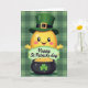 This greeting card features a cheerful, plump golden character with wide black eyes, rosy cheeks, and a big smile, wearing an emerald green leprechaun hat with a gold buckle. Its arms reach forward as if offering a friendly hug, giving the scene a cozy, companionable energy 💚. Across its hands sits a light green banner near the upper middle that reads “Happy St. Patrick’s day” in darker green lettering, with small decorative touches around the words. Below the character, a shiny black cauldron rests in the lower portion of the design, piled high with bright gold coins that catch the light. A green shamrock decorates the front of the pot, tying the colors together with a classic St. Patrick’s Day symbol ☘️. The background is a textured, hand-drawn plaid made from several shades of green, adding depth while keeping the main figures easy to spot. The gold character, banner, and pot are centered and stacked vertically, creating a simple top-to-bottom layout. Behind them, the green plaid lines crisscross in soft, uneven strokes with darker green accents.