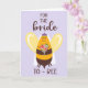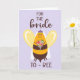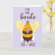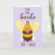 C'est une drôle de carte de Fête des mariées avec une abeille portant une couronne avec un voile portant un bouquet de fleurs avec un ruban blanc. Le texte dit "Pour que l'épouse soit abeille".