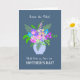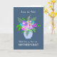 Cette jolie carte de voeux fleurie contemporaine de la Fête des Mères de loin présente un bouquet de fleurs roses, bleues et blanches dans un vase bleu pâle sur un arrière - plan bleu foncé. Le message d'accueil sur la couverture avant est "Across the Miles!" en blanc écriture manuscrite en haut. Sous le vase des fleurs, on dit : "Avec beaucoup d'amour" puis "JOUR DE LA MÈRE !" dans une lettre décorative. Le message intérieur n'est qu'une suggestion et vous pouvez facilement le modifier ou le supprimer complètement si vous préférez une carte "vide intérieur".