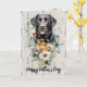Carte de Fête des pères de laboratoire noire avec message à l'intérieur. Chess pièces design arrière - plan avec accueil personnalisé sur le devant. Le récupérateur du Labrador se trouve parmi les fleurs sauvages dans cette conception. Toutes les parties de la carte, à l'intérieur comme à l'extérieur, ont un motif arrière - plan de pièces d'échecs et de coeurs dans des tons sepia clairs.