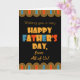 Une carte de Fête des pères design d'un groupe de familles, dans un style Art déco. Le message d'accueil est : "Je vous souhaite une FÊTE DES PÈRES très HEUREUSE de Nous tous !" en rouge vif, bleu et jaune doré sur un arrière - plan noir. Il y a des motifs Art Déco incurvés en haut et en bas et le message intérieur est juste une suggestion que vous pouvez facilement changer ou supprimer complètement si vous le souhaitez.