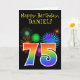 L'avant de cet amusement, design de carte vibrant de salutation d'anniversaire comporte un motif coloré inspiré par les feux d'artifice de célébration, avec le nombre "75" comportant un motif de gradient inspiré par arc-en-ciel multicolore, sur un arrière - plan coloré par noir. L'avant comporte également un message de salutation d'anniversaire, y compris un nom réceptif personnalisé. Les caractéristiques intérieures un message customisé de salutation d'anniversaire, ou pourraient peut-être être dégagées et sont parties du blanc si un message doit être écrit à la main à la place. Une carte d'anniversaire personnalisable comme ceci pourrait être une manière d'amusement d'envoyer des souhaits d'anniversaire à quelqu'un qui célèbre leur cinquième anniversaire soixante-dix. [~Z0000330]
