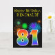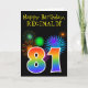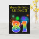 L'avant de cet amusement, design de carte vibrant de salutation d'anniversaire comporte un motif inspiré par feux d'artifice de célébration colorés, avec le nombre "81" comportant un arc-en-ciel multicolore comme le motif de gradient, sur un arrière - plan coloré par noir. L'avant comporte également un message de salutation d'anniversaire, y compris un nom réceptif personnalisé. Les caractéristiques intérieures un message fait sur commande de salutation d'anniversaire, ou pourraient peut-être être dégagées et sont parties du blanc si un message doit être écrit à la main à la place. Une carte d'anniversaire personnalisée comme ceci pourrait être une manière d'amusement de reconnaître quelqu'un le premier anniversaire quatre-vingts. [~Z0000330]