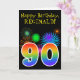 L'avant de cet amusement, design de carte vibrant de salutation d'anniversaire comporte un motif inspiré par feux d'artifice de célébration colorés, avec le nombre "90" comportant un motif de gradient inspiré par arc-en-ciel multicolore, sur un arrière - plan coloré par noir. L'avant comporte également un message de salutation d'anniversaire, y compris un nom réceptif personnalisable. Les caractéristiques intérieures un message personnalisable de salutation d'anniversaire, ou pourraient peut-être être dégagées et sont parties du blanc si un message doit être écrit à la main à la place. Une carte d'anniversaire personnalisable comme ceci pourrait être une manière d'amusement de reconnaître quelqu'un quatre-vingt-dixième anniversaire. [~Z0000330]